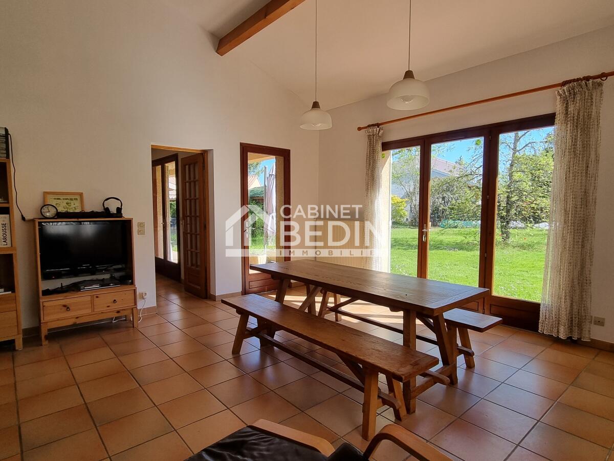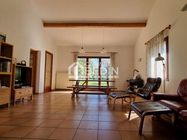 - Entrée, vaste salon-séjour très ensoleillé grâce à sa triple exposition, cuisine dinatoire ouvrant sur terrasse, chambre avec salle d'eau / WC, buanderie, WC indépendant, buanderie et garage double avec accès direct à l'habitation.