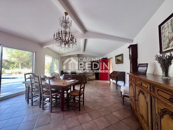 Dès l’entrée, une vaste pièce de vie baignée de lumière s’ouvre sur une superbe terrasse et une grande piscine, au cœur d’un jardin paysager et bucolique de plus de 3 000 m². La cuisine, indépendante et fonctionnelle, bénéficie également d’un accès direct sur l’extérieur.
