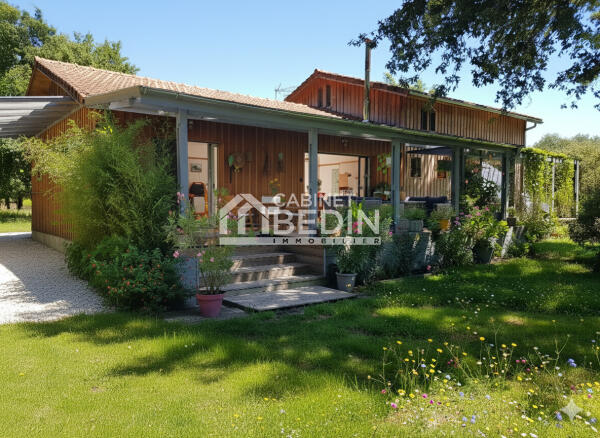 Maison contemporaine en bois à Ste Hélène, proche Bordeaux, sur un parc de 2 hectares. Architecture élégante, grand séjour lumineux, performance énergétique B. Havre de paix sans vis-à-vis, idéal pour nature et calme.