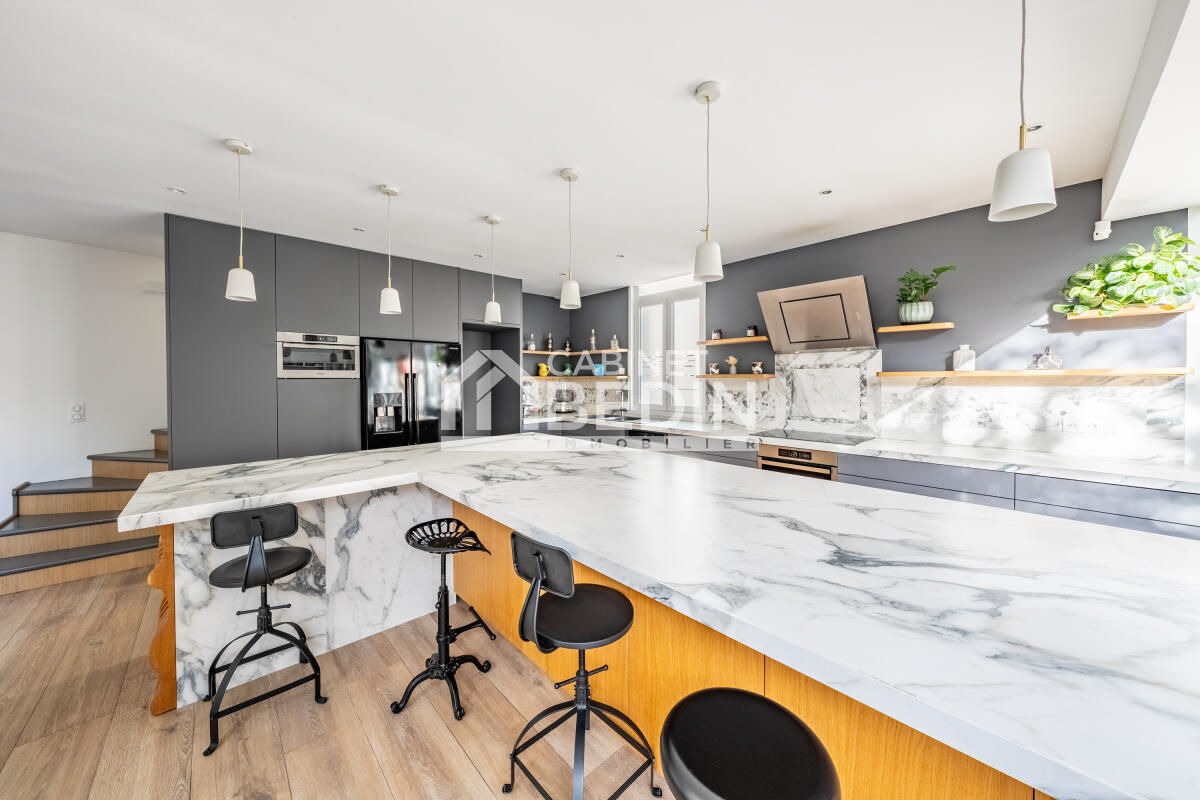 La cuisine équipée pièce maitresse de la pièce de vie, offre un espace dinatoire convivial ouvert sur un séjour avec plafond cathédrale de 6m de hauteur environ.