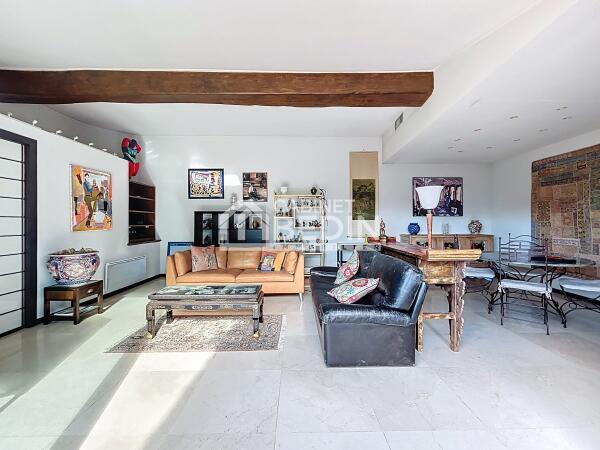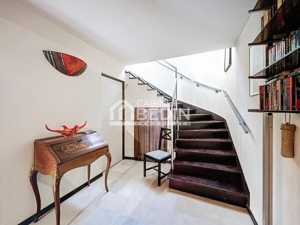 Elle est composée au rez de chaussée d'une surface au sol de 150 m² environ comprenant 1 studio, 2 garages et divers locaux techniques. A l'étage l'habitation comprend un grand séjour salon lumineux donnant accès à une belle terrasse, une cuisine séparée, une grande chambre, une salle de bains, un WC séparé, le tout sur une surface de plus de 100 m².