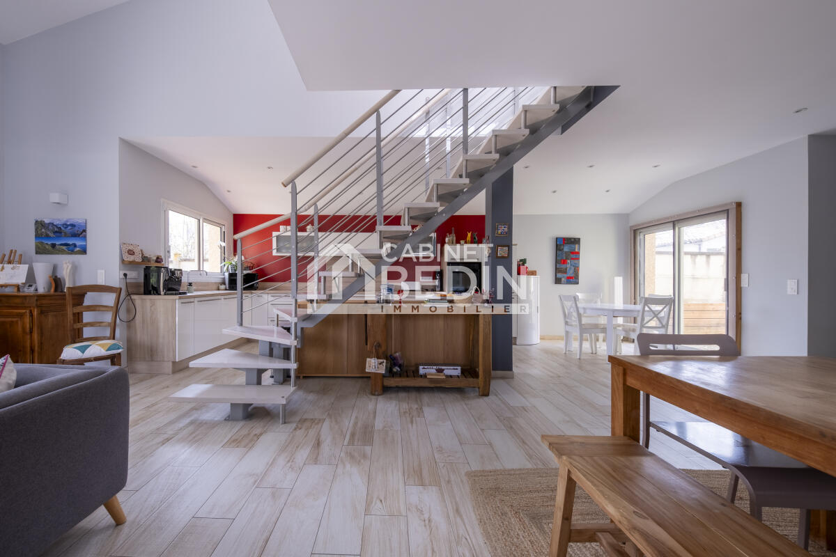 Maison contemporaine de 175 m² construite en 2015, offrant confort moderne et performance énergétique . Elle se compose d’une pièce de vie lumineuse ouverte sur le jardin, d’une suite parentale en rez-de-chaussée avec buanderie, et à l’étage de deux chambres avec mezzanine ainsi qu’une salle d’eau avec WC.