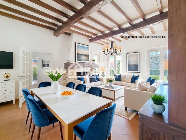 La maison propose de beaux volumes lumineux, avec une architecture sobre et parfaitement intégrée à son environnement et distribue une cuisine avec un cellier attenant, un séjour- salle à manger, cheminée et poutres apparentes, cinq chambres et un bureau, une salle de bains et une salle d'eau, un dressing et des combles exploitables. Un garage attenant complète le bien.
