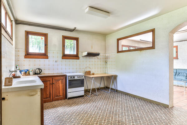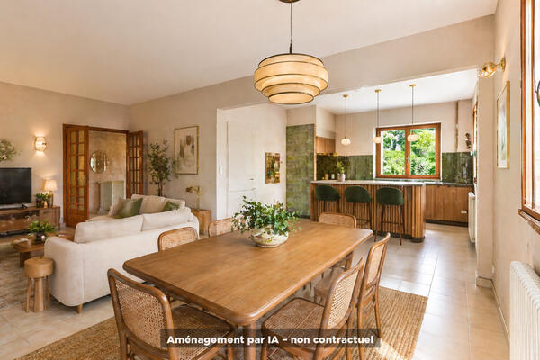 Le rez-de-chaussée propose un second univers, idéal pour recevoir, télétravailler ou imaginer un espace indépendant : salon, cuisine, deux chambres, bureau et buanderie composent ce niveau aux multiples perspectives.