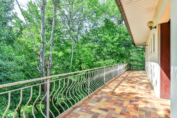 À l’extérieur, le jardin arboré invite à la détente, tandis que la terrasse s’ouvre sur une vue apaisante sur la végétation.
