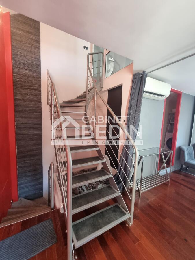 À l’étage : appartement T2 en duplex, lumineux et plein de caractère.